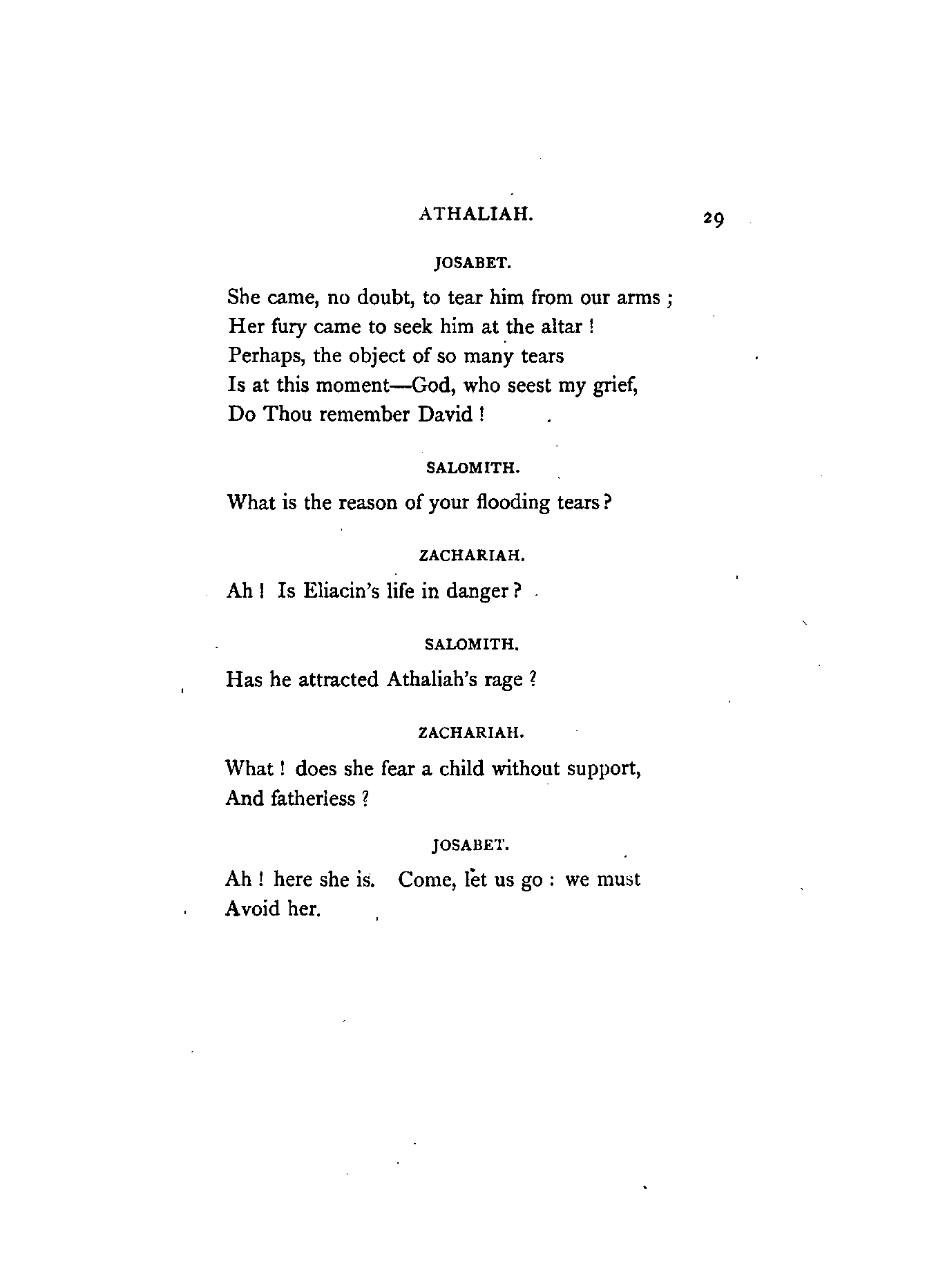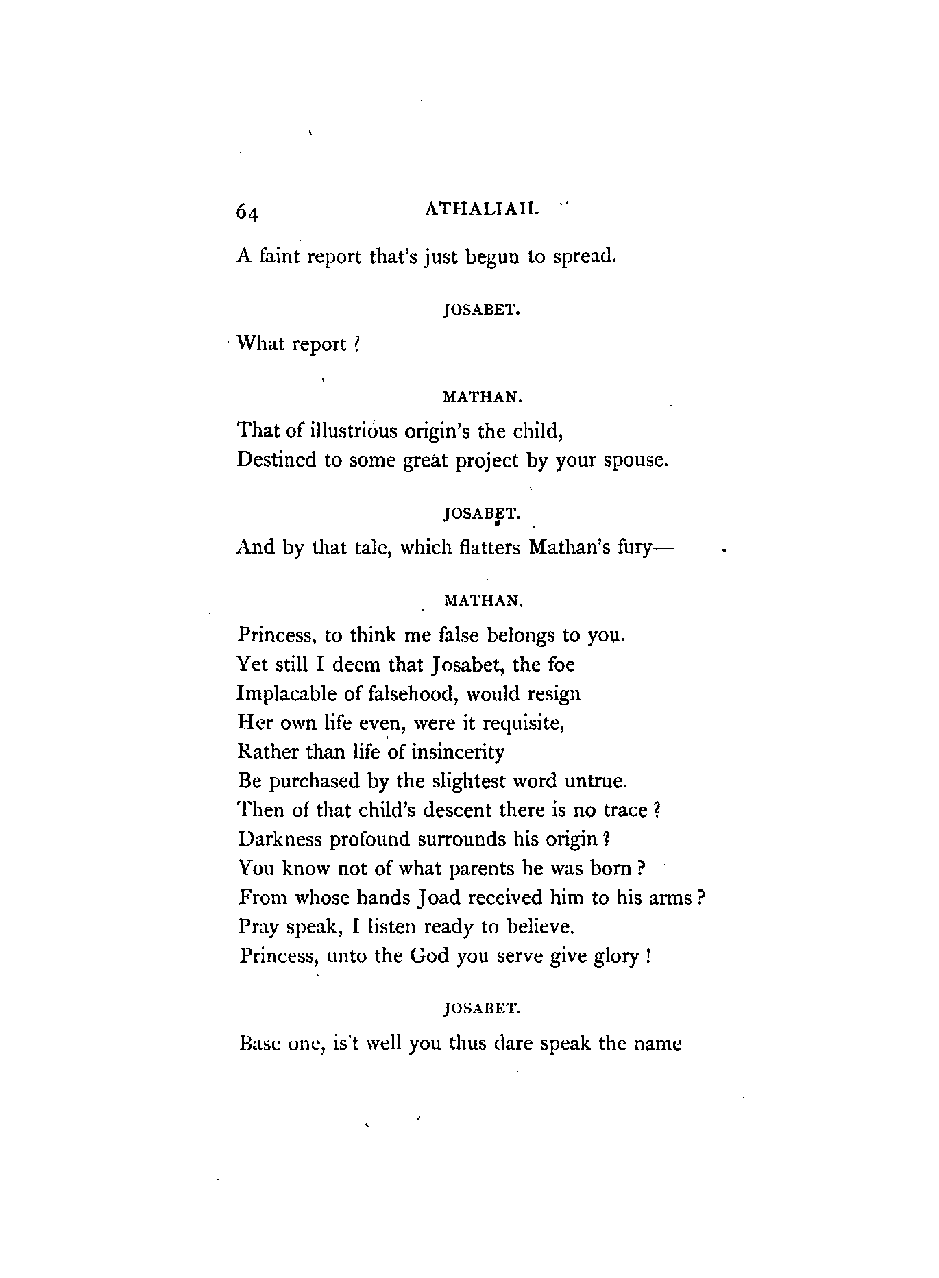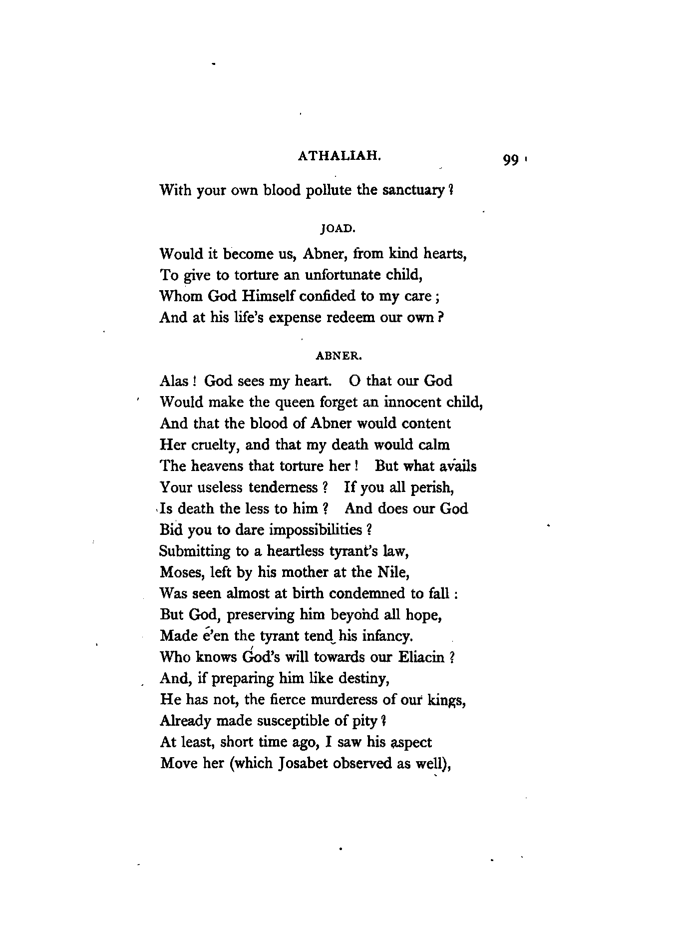 Racine, the author of Athalie (Athaliah), flourished in the latter half of the 17th century. At his appearance, Corneille, the great French Dramatist, was in the full splendour of his fame, whose rival he was afterwards recognised to be. Athalie is a Tragedy in rhyme, consisting of six Iambic feet, similar to the Alexandrine verse found occasionally in our English poets at the termination of a sentence or paragraph. Dryden, and a few others of less note, in the reign of Charles IL, introduced the rhyming drama to the English public; but the clank of its fetters was unpleasant to the British ear, which had become attuned to the freedom and majesty of blank verse. Blank verse, therefore, being our recognised vehicle of dramatic productions, has been employed in this translation. I did, however, intend in the first place to render the chorus into rhyme; but after maturer consideration it appeared to me that irregular blank verse would be more capable of tragic expression; and that it would also be more in harmony with the [4]Hebrew rhythm as represented by the scriptures, from which the plot was appropriated.