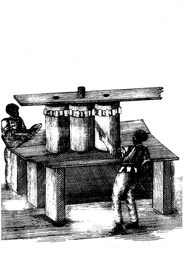 Todos os engenhos de fazer Assucar na Capitania do Rio de Janeiro, qualquer que seja a potencia, agua, bestas, ou bois, tem a mesma construcção, [18] á excepção de tres modernamente feitos, que reunem algumas vantagens, todos os mais he hum grande pião, que faz fazer huma casa de sessenta palmos livres, acabando em varandas á roda, algumas subdivididas; cujas varandas são maiores, ou menores, segundo o destino, que se lhes dá, de picadeiro, casa de caldeiras, casa de purgar, casa de encaixe, casa de aguardente, fornalhas, e varandas de carros; com algumas trapeiras para dar sahida ao fumo, e luz. No centro desta grande casa de sessenta palmos, se o engenho he moido por animaes, está a meza com as moendas; na moenda do meio, vulgarmente chamada a moenda grande, que pela sua dentadura faz moer as dos lados, há quatro aspas, ou almanjarras, a cada huma das quaes puxão dois animaes, formando hum circulo á roda da meza, de cincoenta e seis palmos de diametro, vindo a ter as almanjarras por onde puxão os oito animaes, vinte e oito palmos de comprido; os dois palmos que faltão para os trinta, ou quatro para sessenta da capacidade da casa, he folga para os animaes, que não devem roçar pelas paredes.