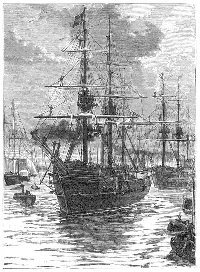 Meanwhile the "Confiance" had attempted the same manœuvre. But her anchors were badly placed; and, though her people worked gallantly, they failed to get the ship round. She bore for some time the effective fire from the "Saratoga's" fresh broadside, but, finding that she could in no way return the fire, struck her flag, two hours and a quarter after the battle commenced. Beyond giving a hasty cheer, the people of the "Saratoga" paid little attention to the surrender of their chief enemy, but instantly turned their guns upon the "Linnet." In this combat the "Eagle" could take no part, and the thunder of her guns died away. Farther down the bay, the "Ticonderoga" had just driven away the last of the British galleys; so that the "Linnet" now alone upheld the cause of the enemy. She was terribly outmatched by her heavier foe, but her gallant captain Pring kept up a desperate defence. Her masts and rigging were hopelessly shattered; and no course was open to her, save to surrender, or fight a hopeless fight. Capt. Pring sent off a lieutenant, in an open boat, to ascertain the condition of the "Confiance." The officer returned with the report that Capt. Downie was killed, and the frigate terribly cut up; and as by this time the water, pouring in the shot-holes in the "Linnet's" hull, had risen a foot above the lower deck, her flag (p. 566) was hauled down, and the battle ended in a decisive triumph for the Americans.