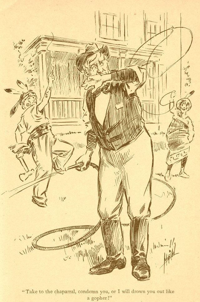 “Garibaldi never crossed the Rubicon, and you couldn’t hit that Italian count on the nose in a week, and if you did he would chase you with a knife, and tree you in the cellar under the kindling wood, and if I interfered he would gash me in the stomach and claim protection from his government, and a war would only be averted between this country and Italy by an apology from the President, saluting the Italian flag by our navy, and an indemnity paid to your dago friend, enough to support him in luxury the balance of his life. So be careful with your birdshot. But, about your Aunt Almira; she was yelling for help this morning, and didn’t come down to breakfast.”