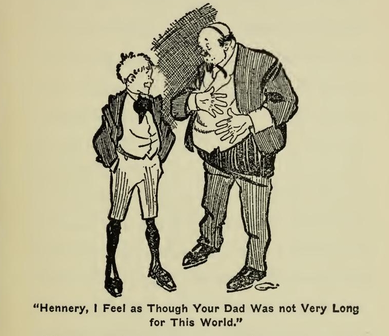 “Never you mind me, Hennery. I will come out of this scrape and have all the Indians on their kpeesan less than an hour, begging my pardon,” and then Pa whispered to me, and I went to pa’s valise and got an electric battery and put it in pa’s pocket and scattered copper wires all around pa’s body, and fixed it so pa could touch a button and turn on a charge of electricity that would paralyze an elephant, and then I got some matches and took the phosphorus off and put it all over pa’s face and hands and clothes and as it became dark and the phosphorus began to shine, Pa was a sight. He looked like moonlight on the lake, and I got the cowboy and the big game hunter and the educated Indian to get down on their knees around pa, and chant something that would sound terrible to the Indians. The only thing in the way of a chant that all of them could chant was the football tune, “There’ll Be a Hot Time in the Old Town Tonight,” and we were whooping it up over pa’s illuminated remains when the Indians came out to put Pa on the fire, and when they saw the phosphorescent glow all over him, and, his face looking as though he was at peace with all the world, and us whites on our knees, making motions and singing that hot dirge, they all turned pale, and were scared, and they fell back reverently, and gazed fixedly at poor pa, who was winking at us, and whispering to us to keep it up, and we did.