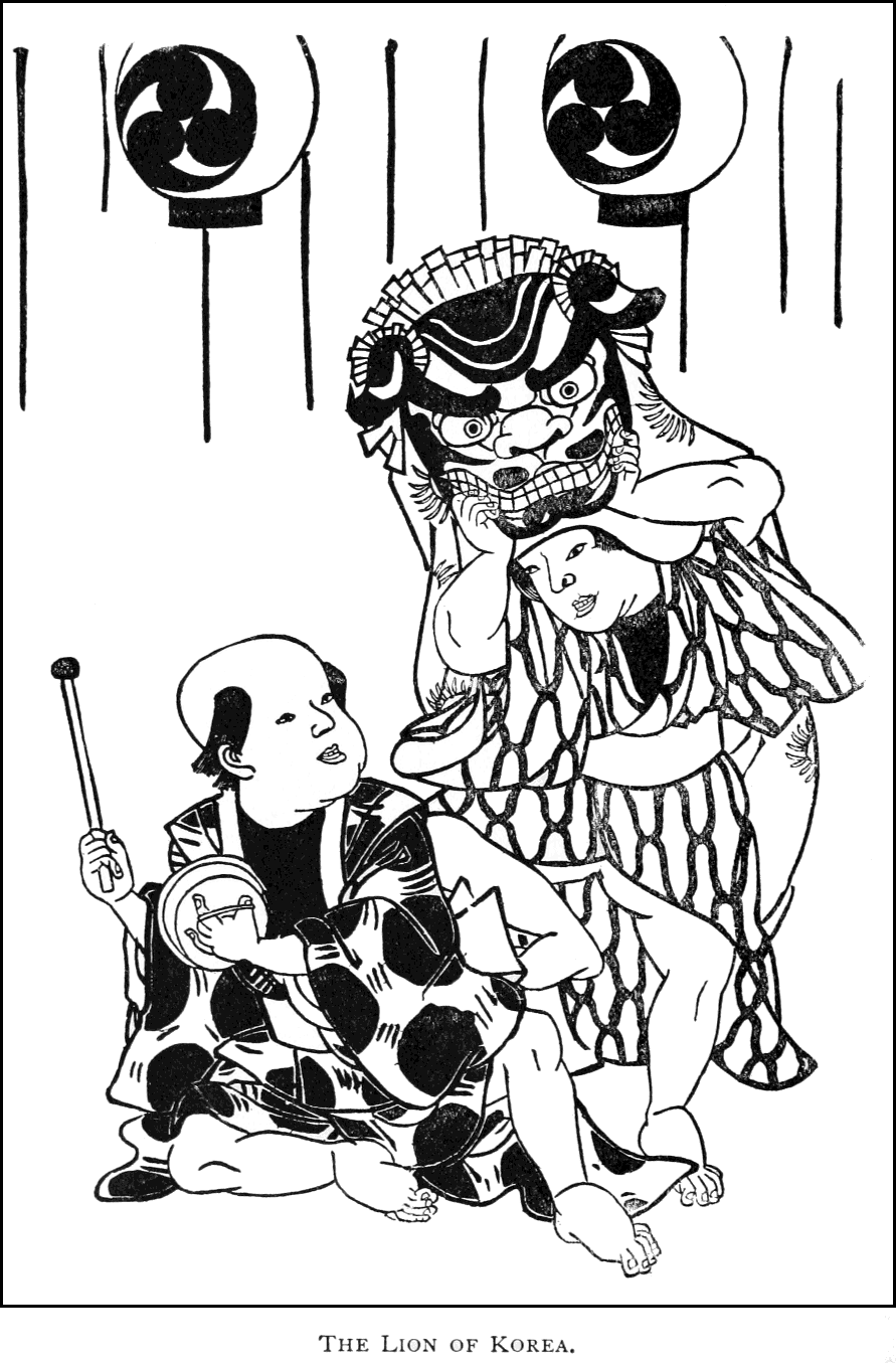 Korean Lion is the title of the picture which forms the frontispiece; it represents a game that children in Japan are very fond of playing. They are probably trying to act as well as the maskers did whom they saw on New[Pg 6][Pg 5] Year's Day, just as our children try and imitate things they see in a pantomime. The masker goes from house to house accompanied by one or two men who play on cymbals, flute, and drum. He steps into a shop where the people of the house and their friends sit drinking tea, and passers-by pause in front of the open shop to see the fun. He takes a mask, like the one in the picture, off his back and puts it over his head. This boar's-head mask is painted scarlet and black, and gilt. It has a green cloth hanging down behind, in order that you may not perceive where the mask ends and the mans body begins. Then the masker imitates an animal. He goes up to a young lady and lays down his ugly head beside her to be patted, as "Beast" may have coaxed "Beauty" in the fairy tale. He grunts, and rolls, and scratches himself. The children almost forget he is a man, and roar with laughter at the funny animal. When they begin to tire of this fun he exchanges this mask for some of the two or three others he carries with him. He puts on a mask of an old woman over his face, and at the back of his head a very different second mask, a cloth tied over the centre of the [Pg 8] head, making the two faces yet more distinct from each other. He has quickly arranged the back of his dress to look like the front of a person, and he acts, first presenting the one person to his spectators, then the other. He makes you even imagine he has four arms, so cleverly can he twist round his arm and gracefully fan what is in reality the back of his head.