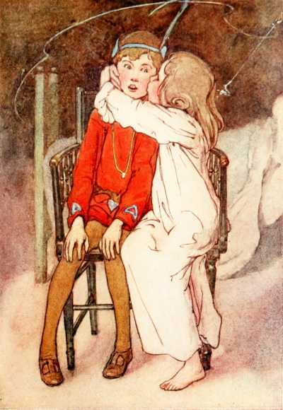 Wendy at once fastened it on a chain which she wore round her neck, and, forgetting the puzzle in his mind, she once more asked him for a kiss.