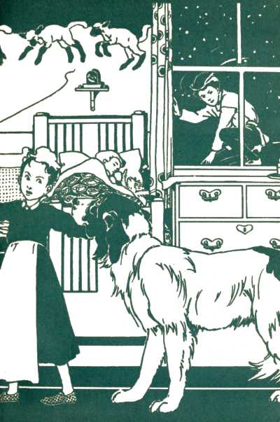 In one of the nicest nurseries in the world there were beds for three young people called John Napoleon, and Wendy Moira Angela, and Michael, the children of Mr. and Mrs. Darling. The nursery was wide and airy, with a large window, and a bright fire with a high fire-guard round it, and a big clock, and prettily-coloured nursery-rhyme pictures over the walls. It was in many ways a most interesting household. For one thing, although[4] there was a pretty little parlour-maid called Liza, the children were bathed and dressed by a big dog called Nana, whose kennel was kept in the nursery.
