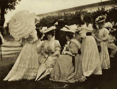 King Alfonso attended one of the famous race meetings near Paris one day last summer, and all the smart Parisian world turned out to do him honour. The display of frocks and millinery was a notable one. The pesage was crowded with women in the airiest and most elaborate of summer toilettes and, suddenly, the heavens opened and a torrent of rain poured down. Such a scurrying and twittering; such little moans and shrieks; such laughter and jesting! Bad temper? Not a bit of it. Things were quite bad enough without losing one's temper. So they chatted and joked and achieved bon mots that almost reconciled them to the facts that their rouge was streaked and their plumes were drabbled and their curls were straggling and their frocks were limp. The sun came out and the demoralized toilettes emerged from under cover, mere wrecks of their former beauty; but the wearers carried the situation off with a good-natured vivacity to which no other women would have been equal. The afternoon was a particularly gay one, and the prevailing philosophy was voiced by one little countess who was heard to say to a friend as they stood waiting for their automobiles: